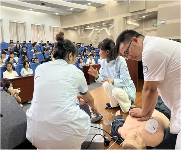 随后培训课程在专业、生动的氛围中有序展开。急救中心专家为同学们带来心肺复苏(CPR)专题教学,他先播放了心肺复苏相关教学视频,让同学们对急救流程有了初步认知;为了让同学们更直观地认识到心肺复苏的重要性,他分享了一组数据:“欧美国家平均约 17%,而我国目前的抢救成功率还不足 1%。” 让在场学生深刻意识到普及心肺复苏知识的紧迫性。随后医护人员共同上台,现场演示自动体外除颤器(AED)的操作流程,从 “开机、听指引、贴片、分析、除颤” 的每一个步骤,都进行了细致讲解,确保同学们能清晰掌握 AED 的使用方法。