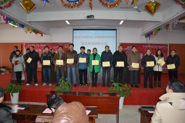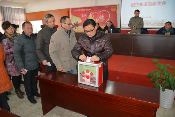 随后举行了中职中心2015年度招生先进表彰会,会议由党委书记刘曙光主持。校党委副书记、纪委书记高传来2015年招生工作总结报告,他详细总结学校2015年招生工作,回顾了一年来招生过程中的得与失,对在招生工作中付出辛勤劳动的老师们进行褒奖,并对来年招生工作提出要求和期望。副校长贾健宣读了2015年度校招生先进个人表彰决定,校领导班子向年度招生先进个人颁发了奖状,七十位老师上台领奖,三名招生先进代表先后发言。