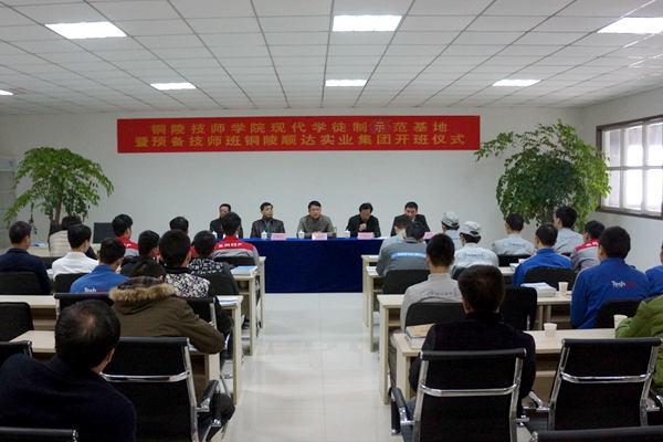 3月10日上午, 我校现代学徒制示范基地揭牌暨预备技师铜陵顺达实业集团班开班仪式在顺达集团二楼报告厅举行。市人社局高训中心主任江雁彬,我校校长杨益民、党委书记刘曙光,铜陵顺达实业集团董事长吴海兵、大地汽车贸易有限公司董事长刘全寿出席揭牌暨开班仪式。我校汽修部负责人、相关专业教师及预备技师班全体学员参加了开班仪式。