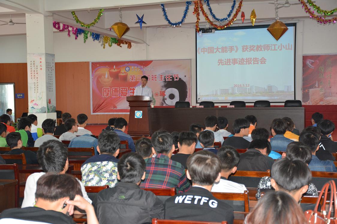 弘扬典型,激励成长成才。5月13日上午,我校举行了江小山老师先进事迹报告会。江小山老师是我省“五一”劳动奖章和《中国大能手》第二季“神秘焊将”一等奖获得者。通过聆听获奖者先进事迹,激励学生尊重职业、尊重技术技能,弘扬工匠精神。