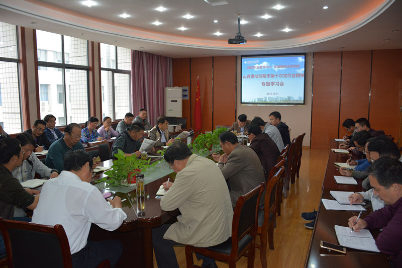 中国共产党铜陵市第十次代表大会于9月25日至28日胜利召开。为贯彻落实党代会精神,切实把思想和行动统一到市委部署要求上来,10月11日下午,学校在商贸楼四楼会议室召开了认真贯彻铜陵市第十次党代会精神专题学习会,集中传达学习铜陵市第十次党代会精神。学校党委班子成员、全体中层以上干部参加了专题学习。学习会由党委书记刘曙光主持。