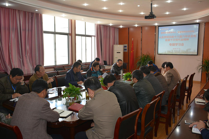 会上,刘书记领学了《中国共产党第十八届中央委员会第六次全体会议公报》,并向与会人员传达了省第十次党代会的主要精神。刘书记强调,学习贯彻十八届六中全会和省第十次党代会精神是全校广大党员当前和今后一个时期的重要政治任务,要把贯彻会议精神与“两学一做”学习教育活动和学校各项实际工作结合起来,增强政治意识、大局意识、核心意识和看齐意识,扎实推进全面从严治党,提高学校党组织的创造力、凝聚力和战斗力。