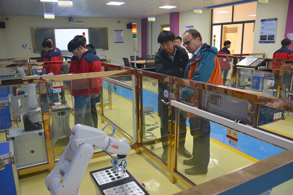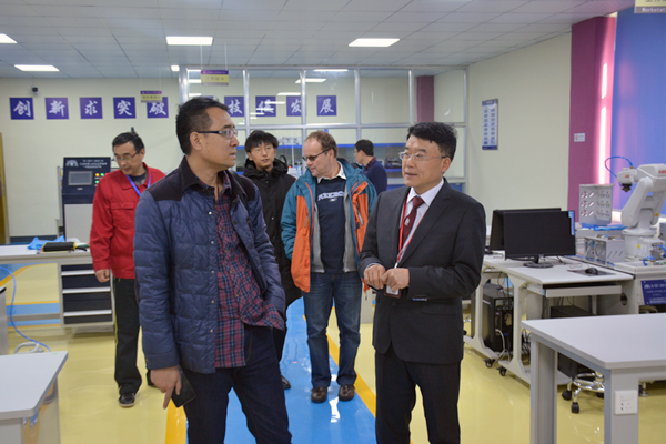 刘海光院长一行在我校杨益民校长等校领导的陪同下,参观了汽修、数控、焊接实训基地和新建的工业机器人实训室、数码工作室等实习实训场所。随后,双方进行了座谈和交流。座谈中,杨益民校长介绍了我校的办学情况和办学规划;刘海光院长介绍了东莞技师学院转型发展、走国际交流合作模式,引进德国二元制和英国学徒制模式并本土化的成功经验;德国专家Torsten Schwartze也在交流中谈到,目前,社会在进步,科技在发展,行业在发展,需要综合性、全面性的人才,如何培养高水平、高质量的专业技术人才使我们的目标,也是我们的责任。双方还在加强合作方面进行了深入交流。