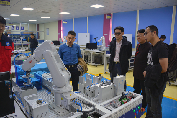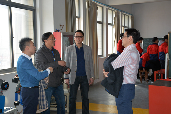 马董事长一行在杨益民校长和贾健副校长的陪同下,参观了汽修、焊接实训基地和工业机器人实训室、数码工作室等实习实训场所。随后,双方在图文信息中心七楼会议室就校企共建创客空间项目工程进行了初步的洽谈。9日上午,马董事长一行与我校相关专业部就创客教育项目进行了深入交流。