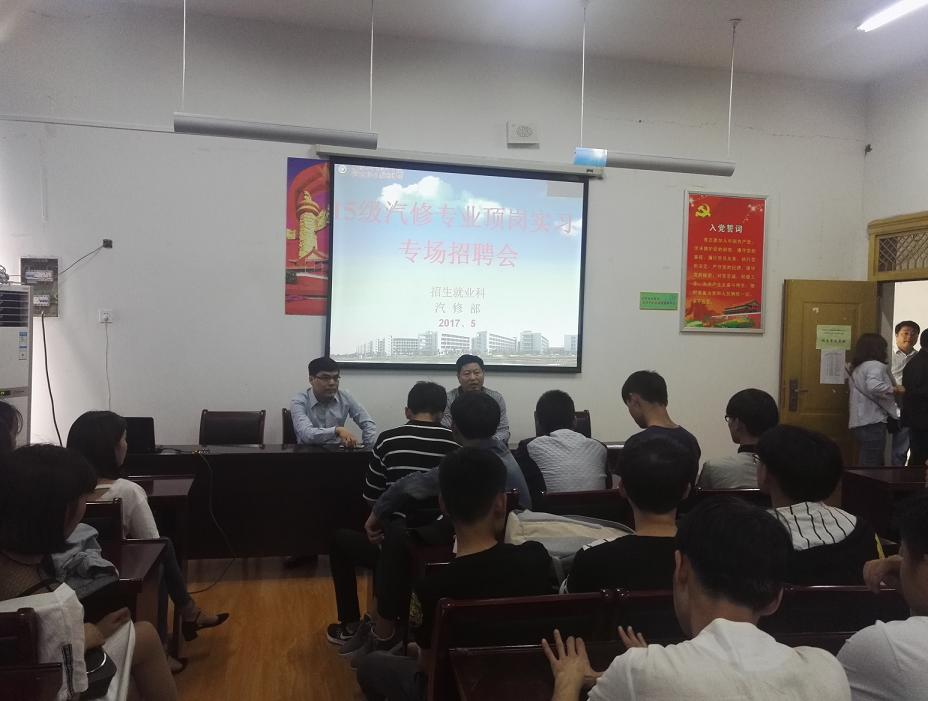 八是校园招聘,搭建就业平台。5月8日下午,我校在商贸旅游实训楼北二楼举行2015级汽修专业顶岗实习专场招聘会。本次招聘会吸引了安徽泰新汽车工业有限公司、锐展(铜陵)科技有限公司、铁牛集团动力研究院、铜陵华胜汽车服务有限公司等4家企业参加。通过举办校园专场招聘会,广泛邀请知名企业到校参加招聘活动,积极为毕业生和用人单位搭建良好的平台,提供热情优质的服务,努力实现我校学生“高质量就业”。