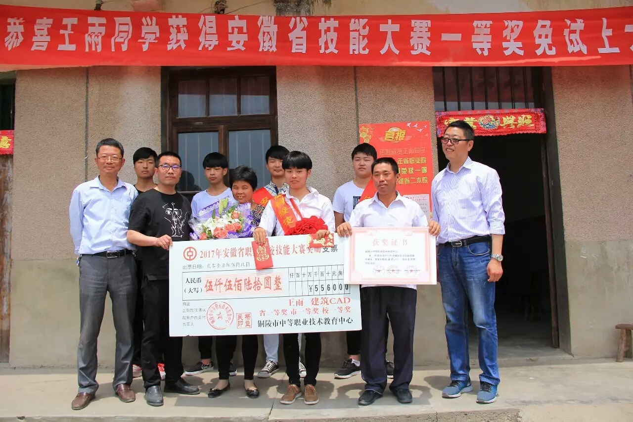 九是表彰优秀,宣传职教故事。汤健、王雨晴、陈浩、盛云亮、王雨五为同学是我校在2017年安徽省职业院校技能大赛中一等奖获奖选手。5月10日,在欢天喜地的锣鼓声中,学校将大红的喜报送到这五位学生的家中,很快喜讯传遍整个村庄,引得左邻右舍前来观看。5月11日,学校举行了省级技能竞赛获奖同学和教练员总结交流会。5月12日下午,学校召开了2017年全省职业技能大赛获奖指导教师表彰大会。通过这些活动,讲述好我校学生成长故事,极大鼓舞了学生及家长,让家长和学生一起享受到了上职校成功的喜悦;同时,让社会关注职教,让老百姓改变观念,读职校学技术,一样能成才,一样能圆大学梦。