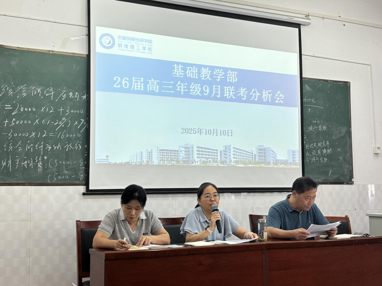 为全面复盘26届高三九月“江淮十校”联考情况,明确下一阶段教学与管理方向,10月10日下午,基础教学部在教学楼104会议室组织召开高三联考分析会。校党委委员、副校长高阳,基础教学部部长赵志武,副部长章玉林以及全体高三教师参会。